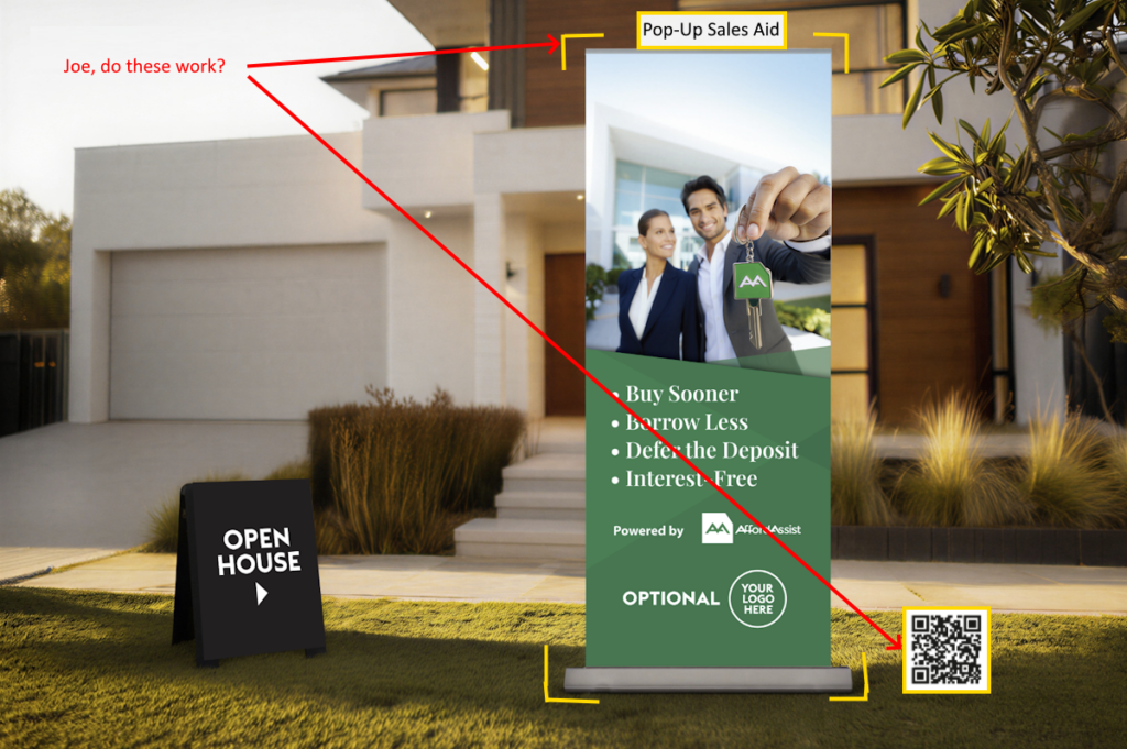 Help buyers move closer to ownership of the property they’re already interested in. This pop-up sales aid is designed to start conversations at open homes and auctions, placed at the entry, inside the home, or in the backyard.